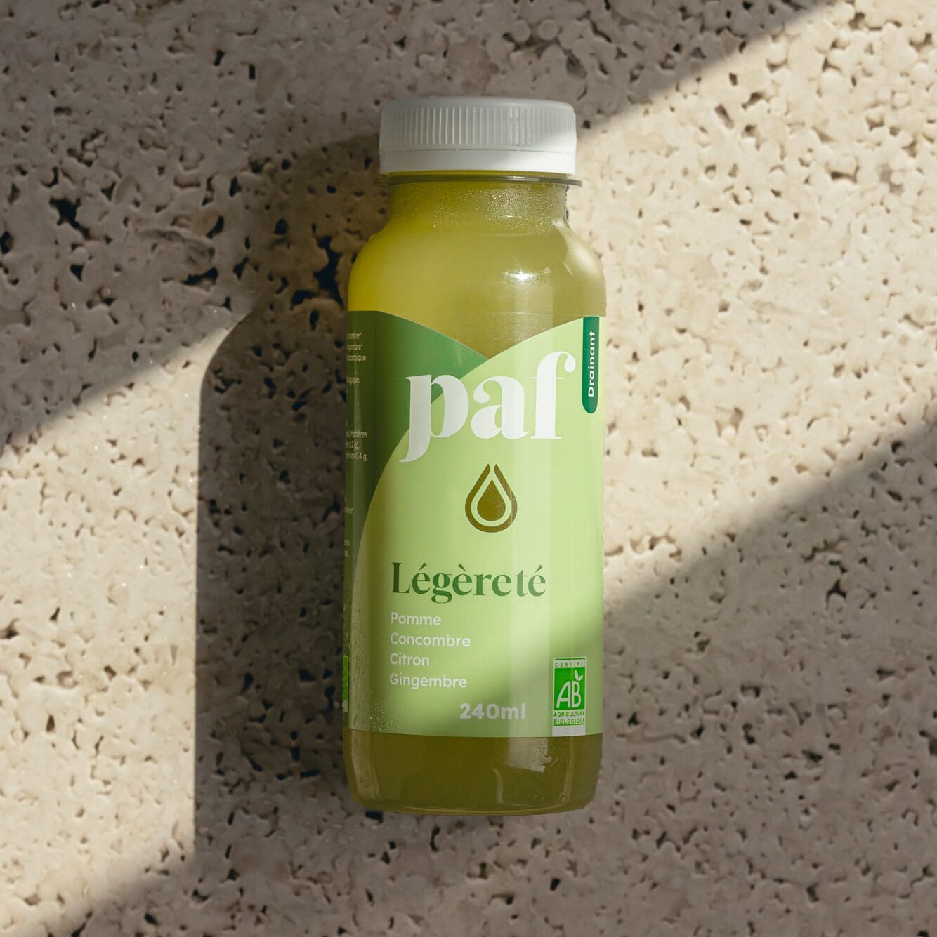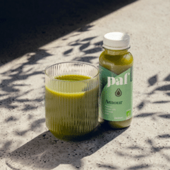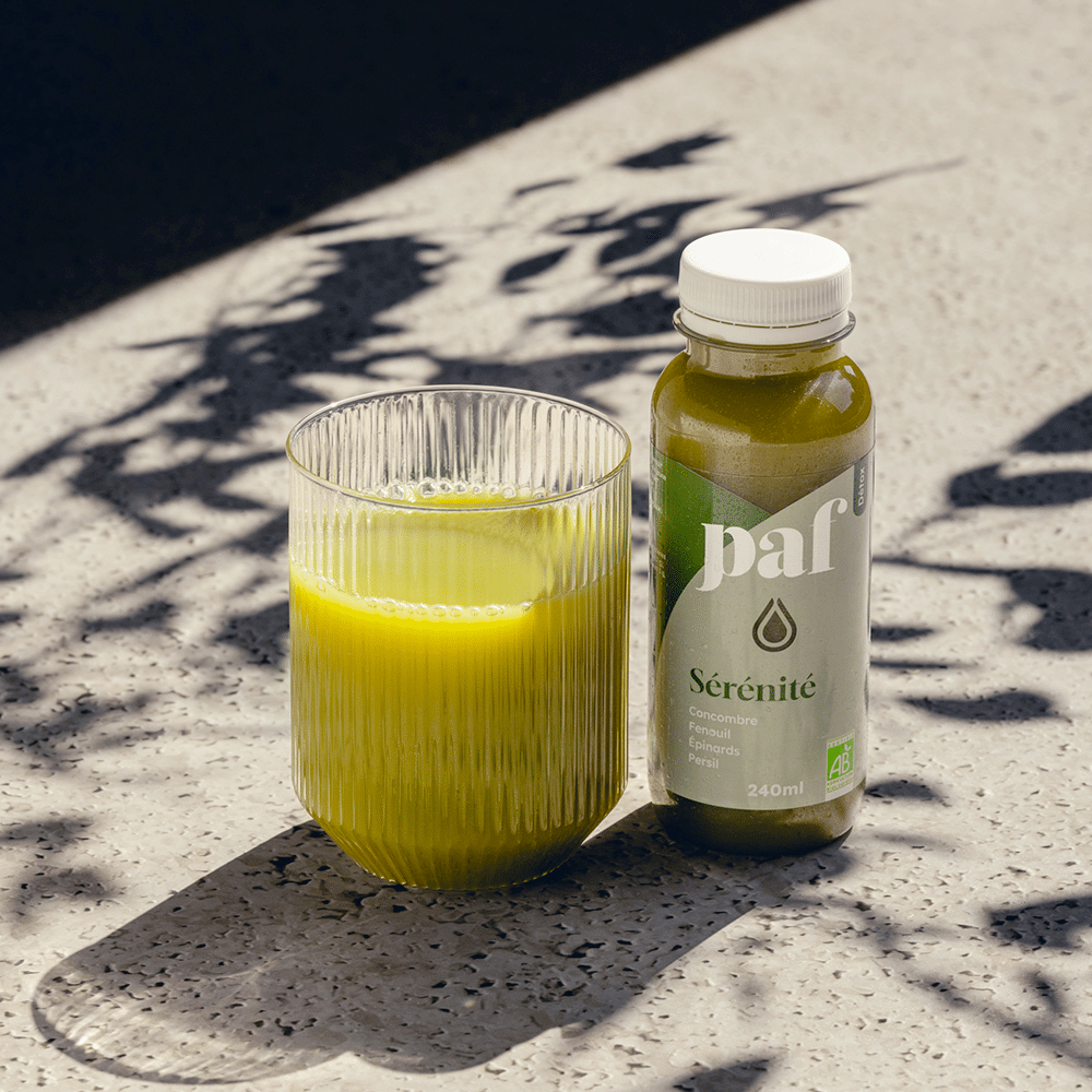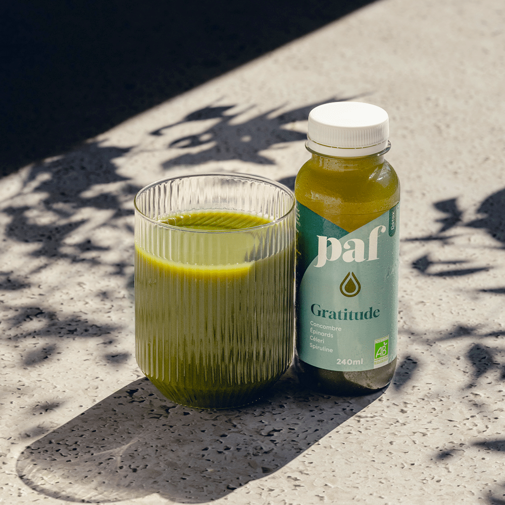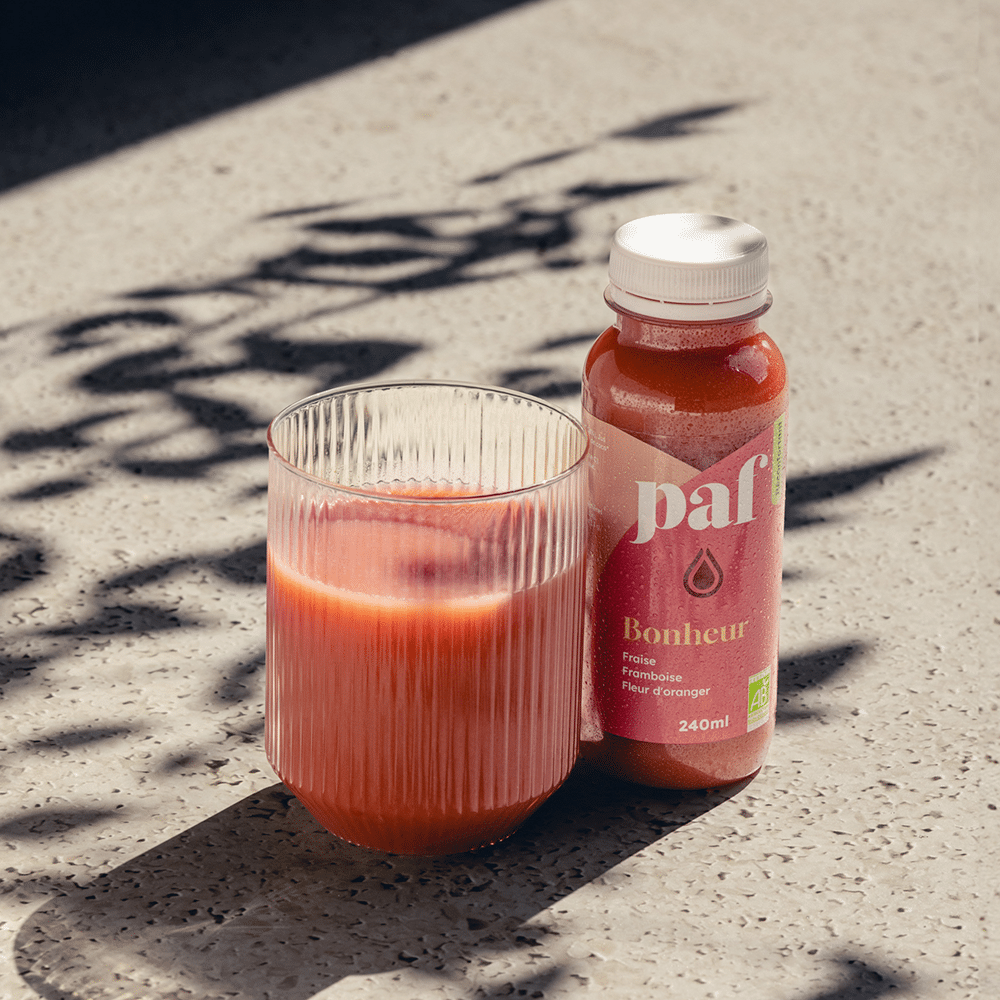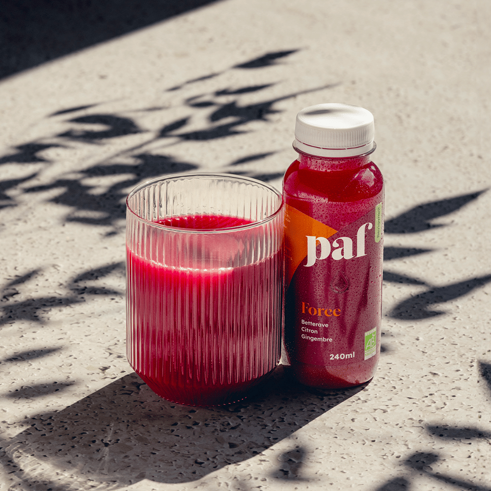 Chez PAF les matières premières sont 100% bio et rigoureusement sélectionnées afin de vous offrir un jus frais comme à la maison, la praticité et l’expertise en plus. Chaque bouteille de 240 ml contient environ 500g de fruits et légumes bio pressés (près d’un demi kilo !), soit l’équivalent de 6 portions, alors que l’OMS nous recommande d’en consommer au moins 5 par jour. Avec un jus PAF vous couvrez l’ensemble des apports nutritionnels dont votre corps a besoin dans une journée.