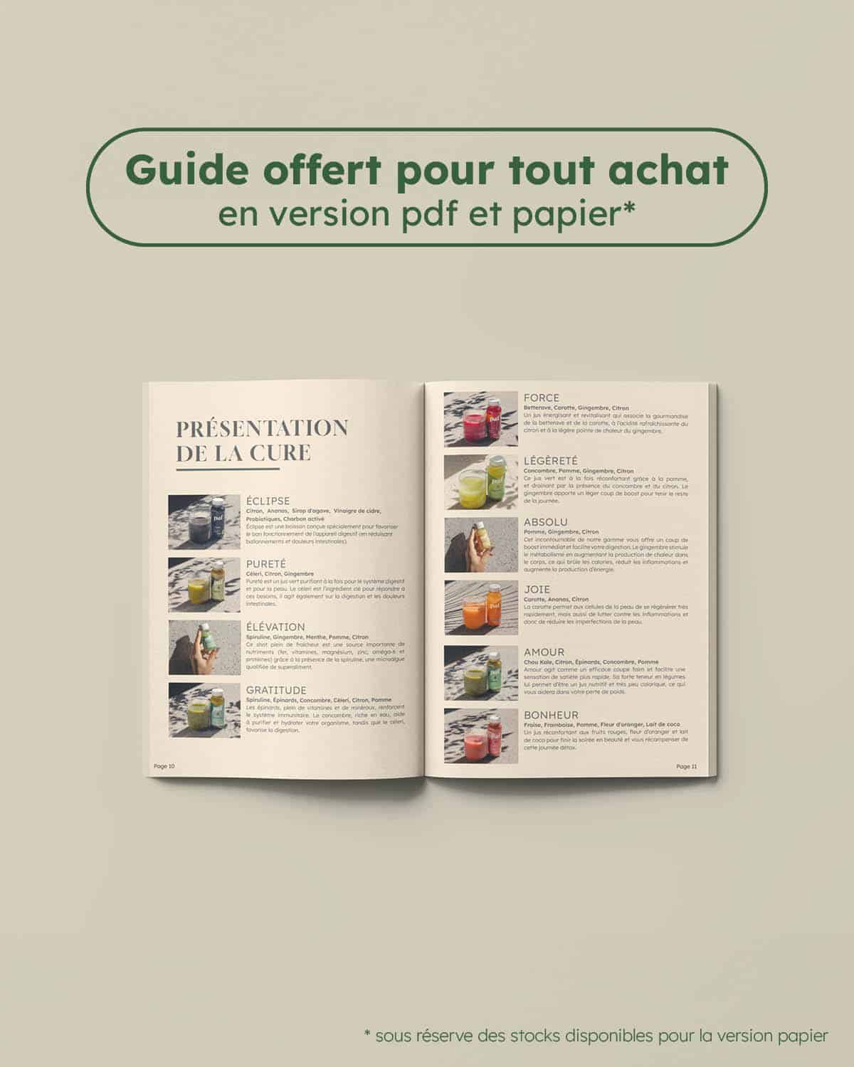- Repartez sur des bases saines et solides grâce à plusieurs jours de cure de jus et shots pressés et extraits à froid.